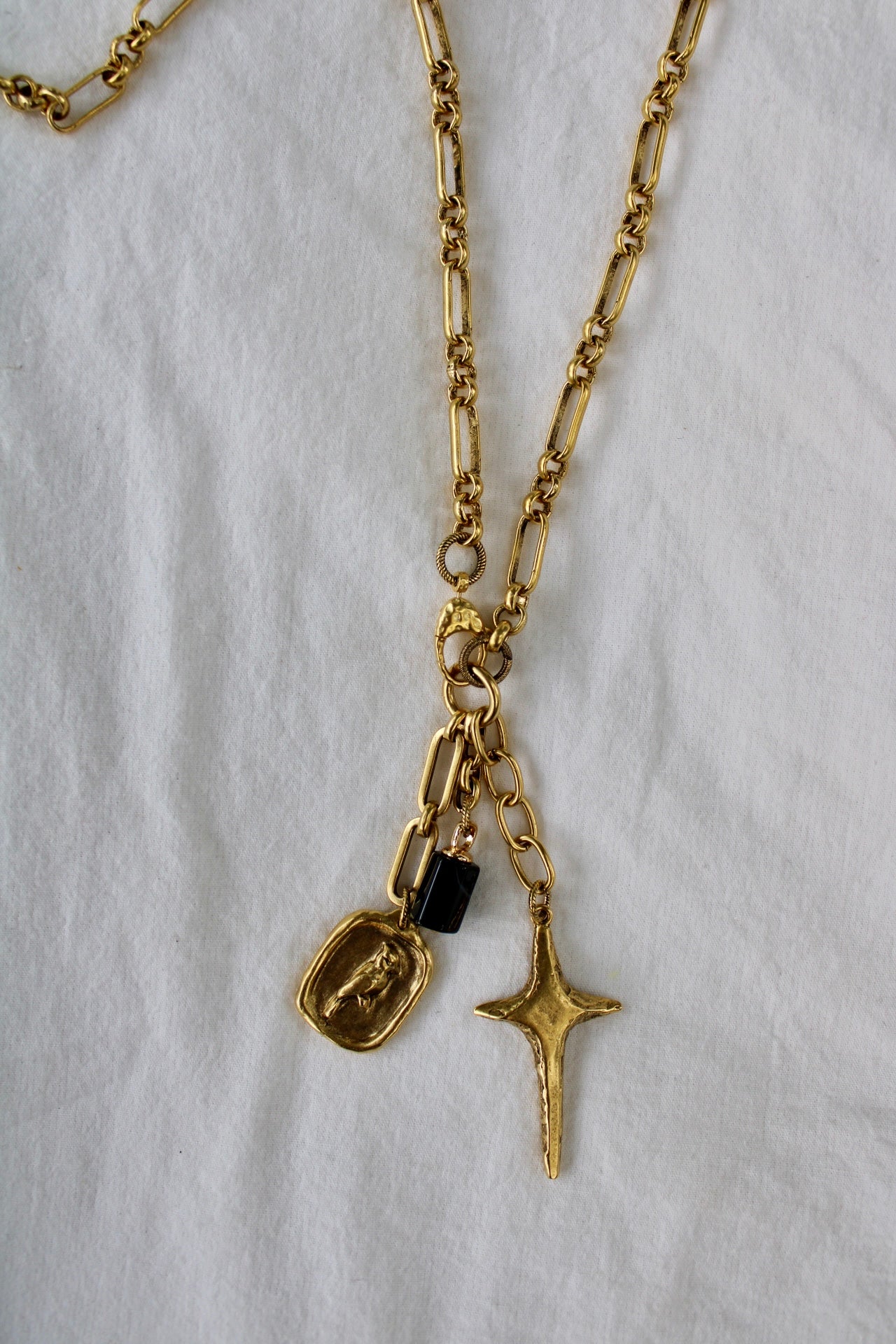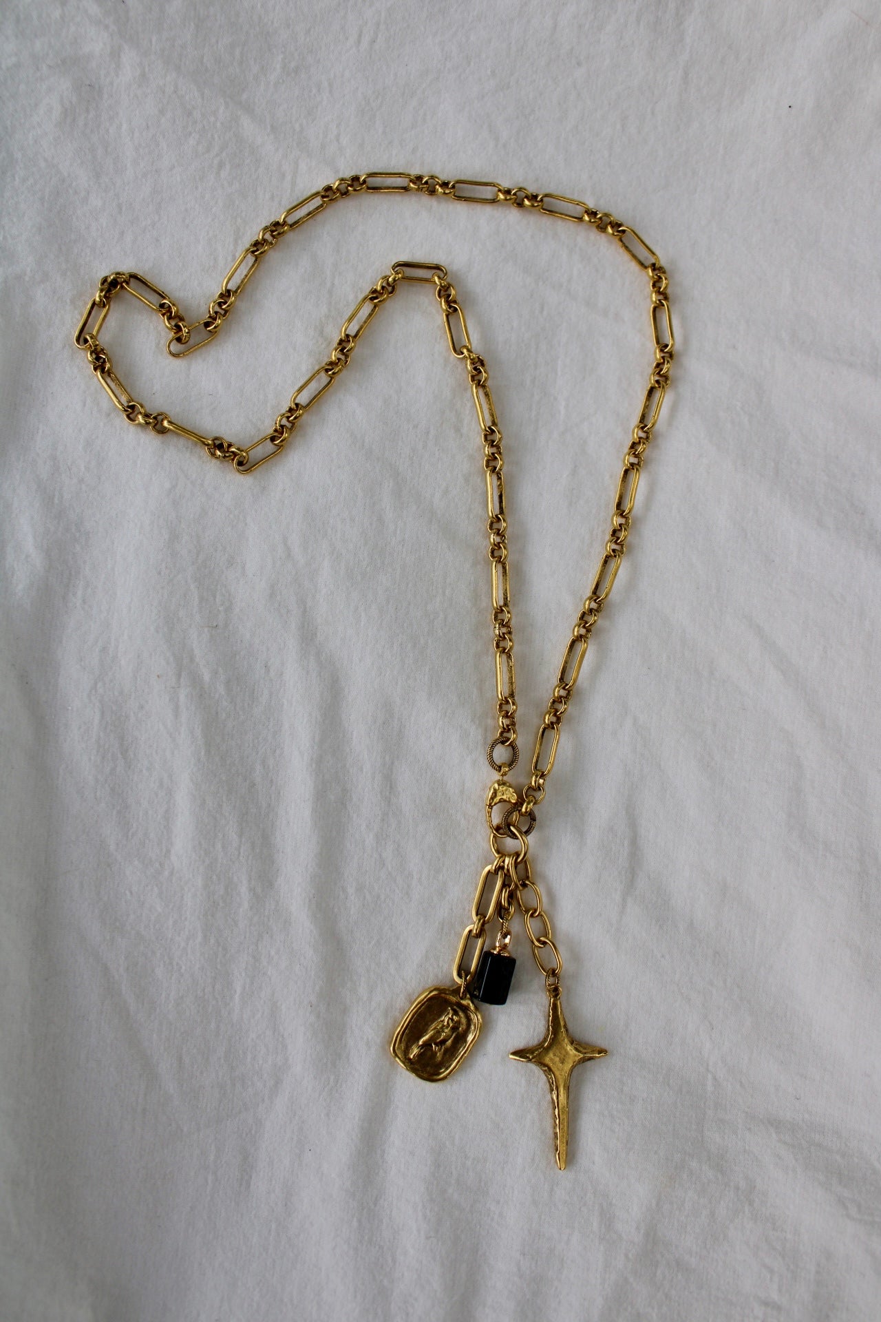 Long (24inch) 12k gold plated, artisan quality chain with 12k gold plated charms and black onyx stone. Statement piece for the untamed and free-spirited.