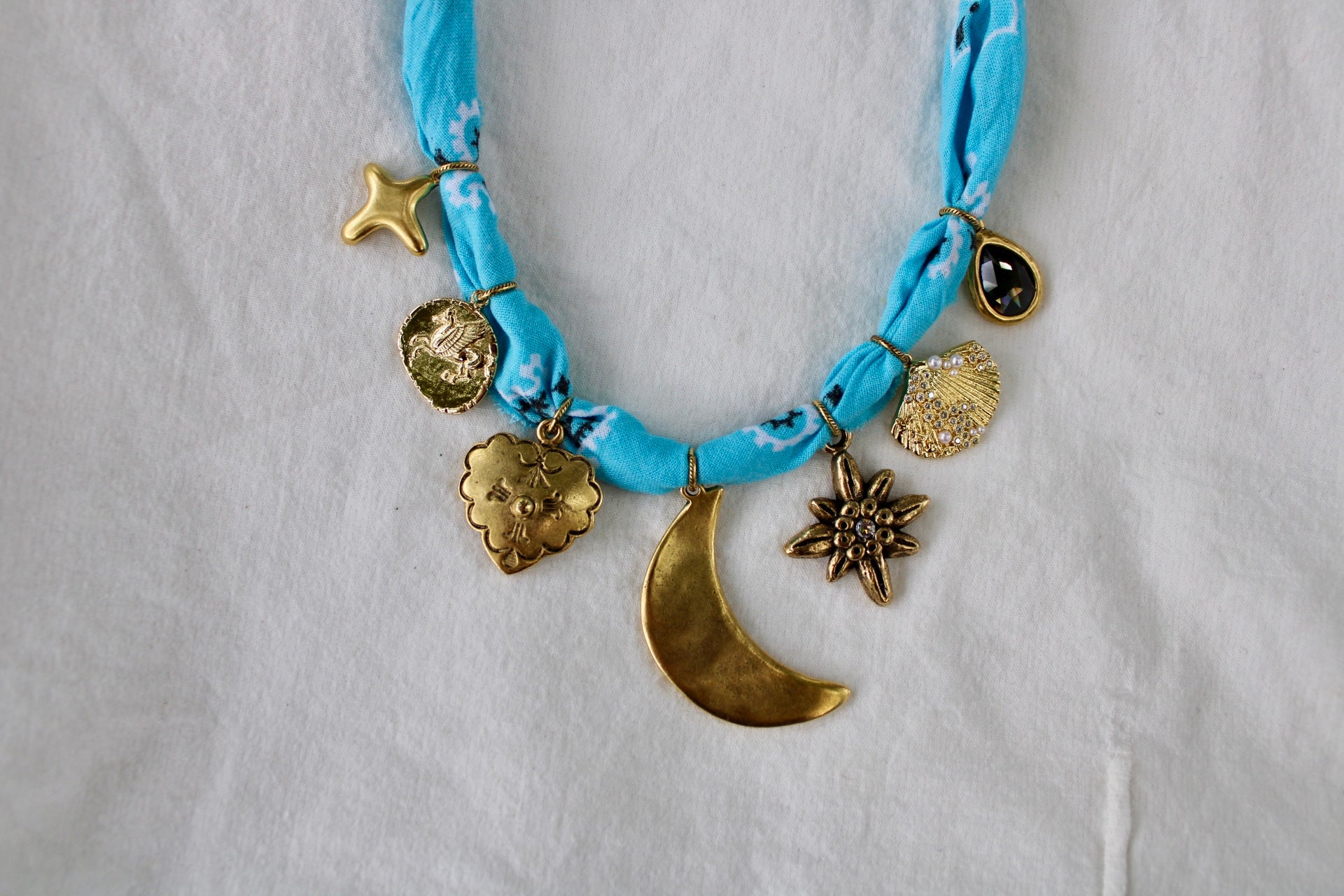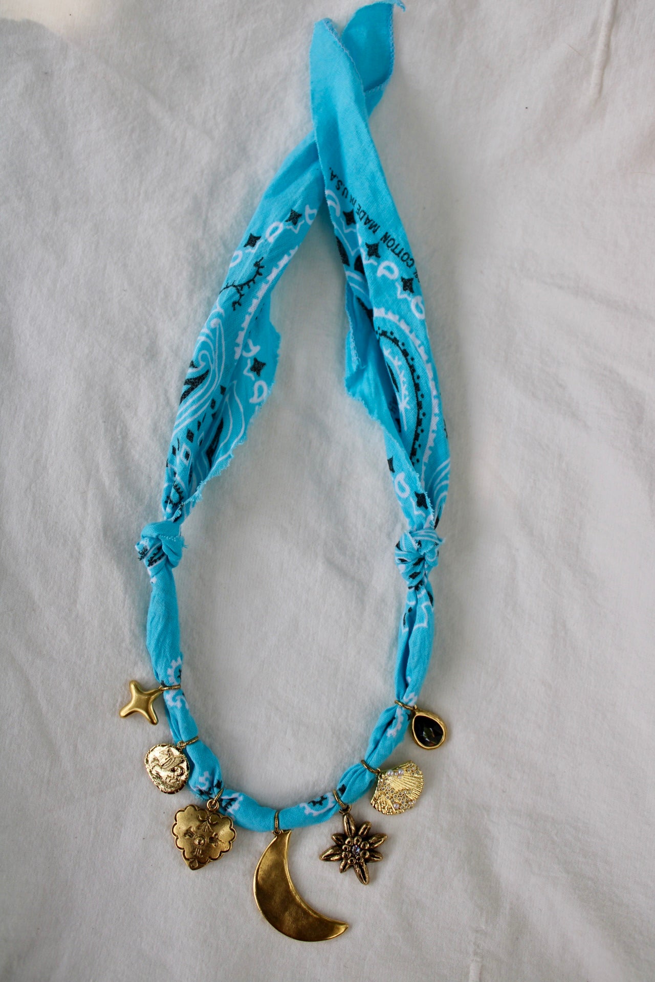 One of a kind handmade necklace with 12k gold plated charms on a hand cut, vintage turquoise blue bandana. Bandana necklaces can be tied to your desired length.