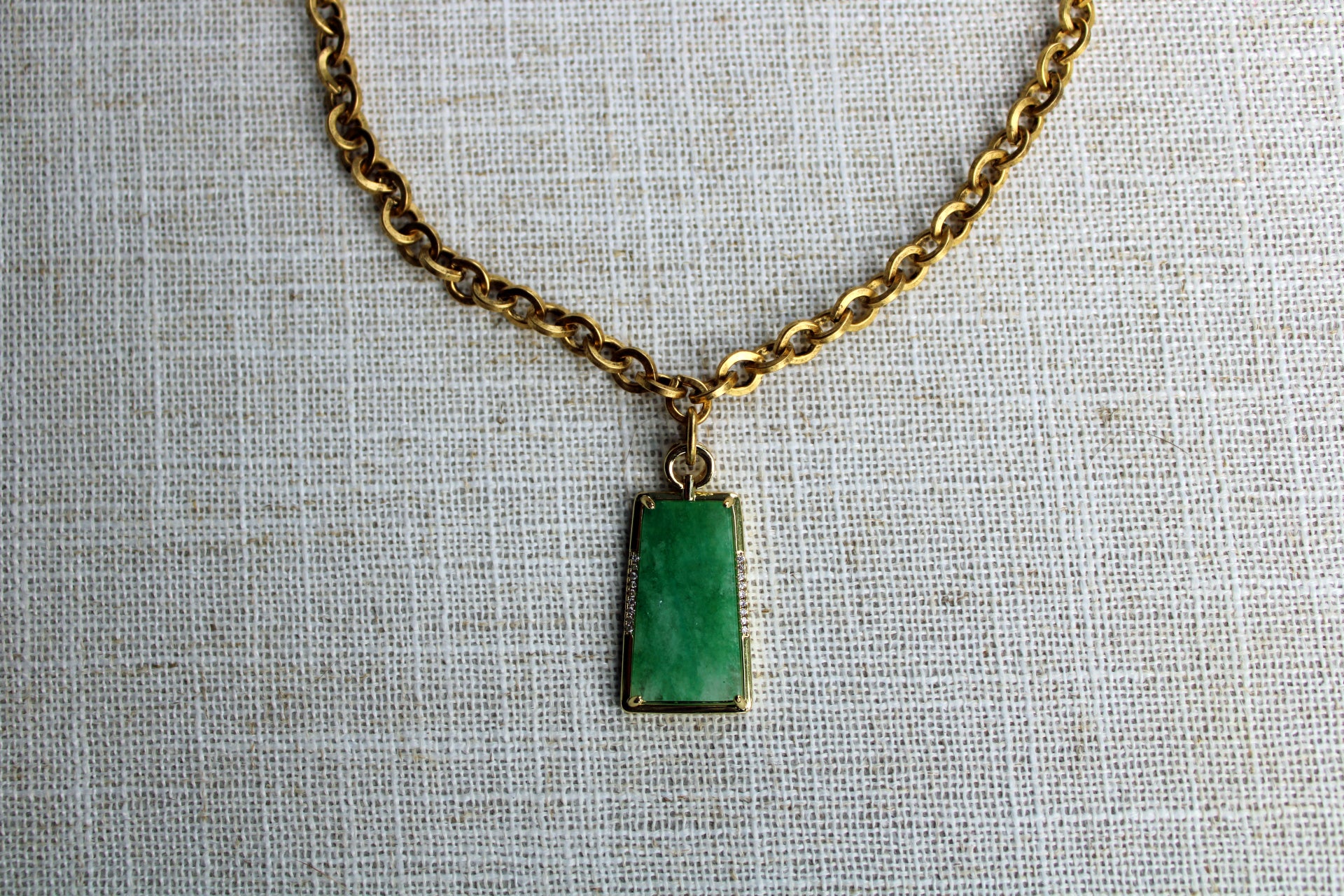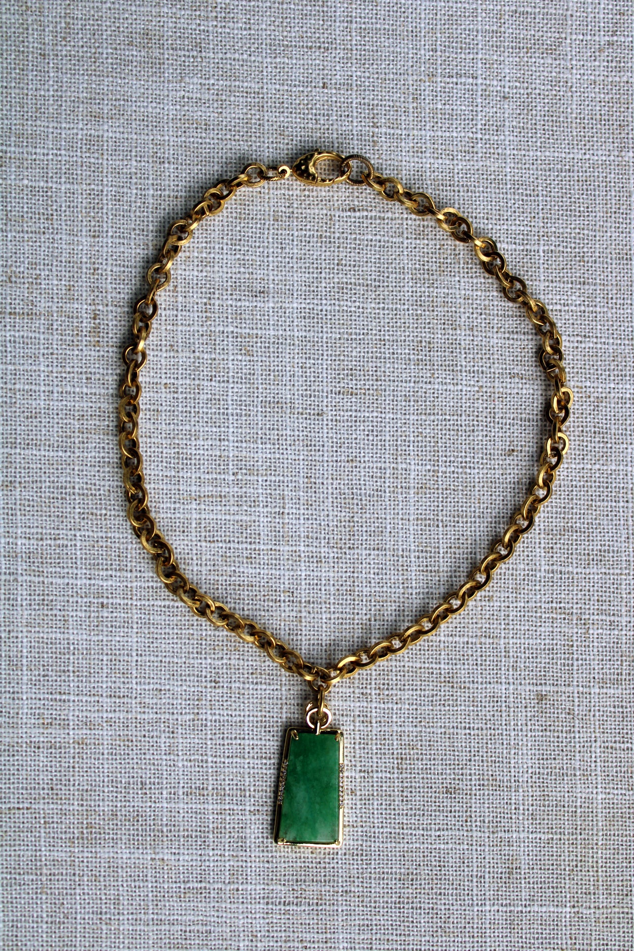 Short chain (15in) one of a kind necklace with a genuine jade and cubic zirconia pendant on a 12k old plated chain and lobster closure.