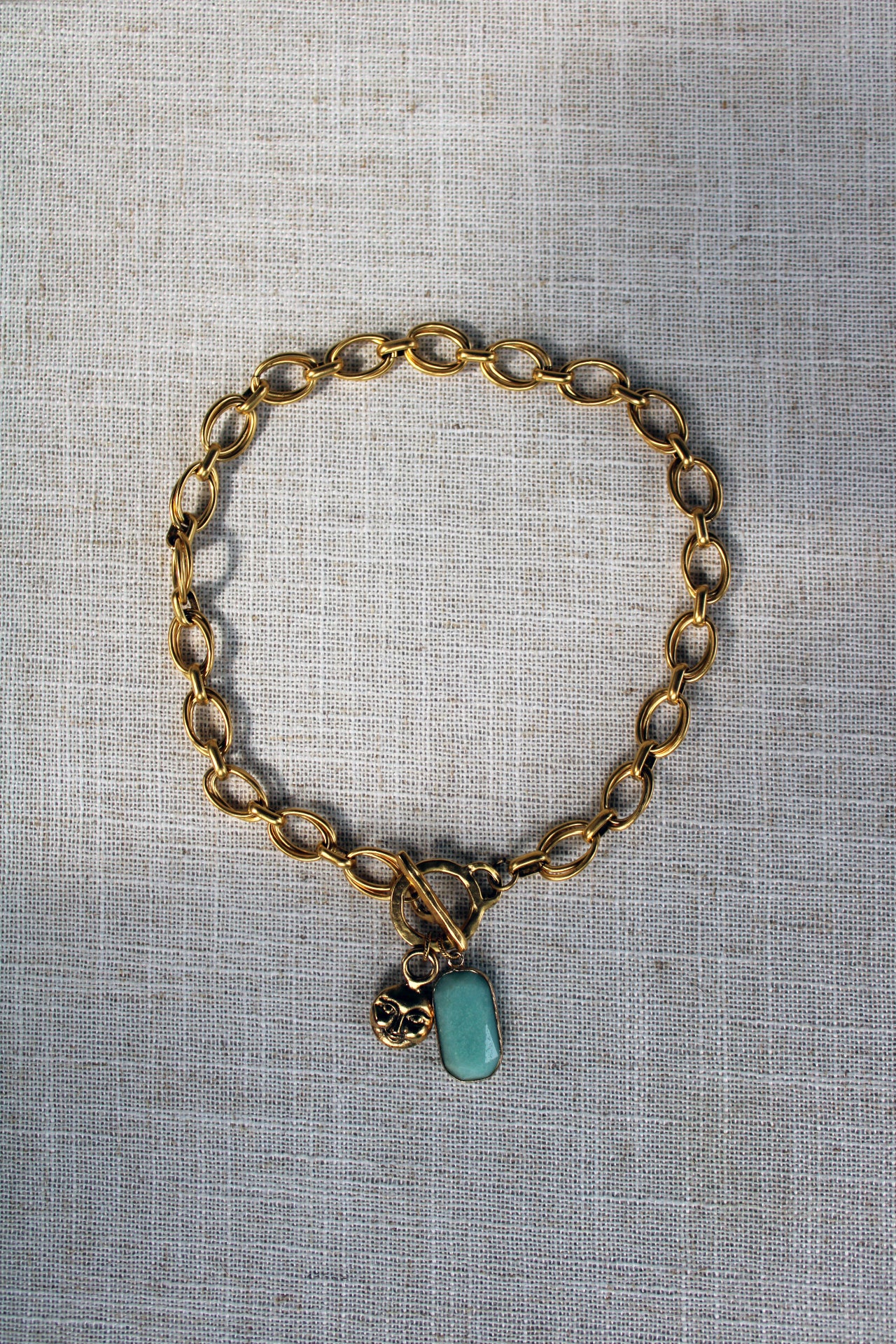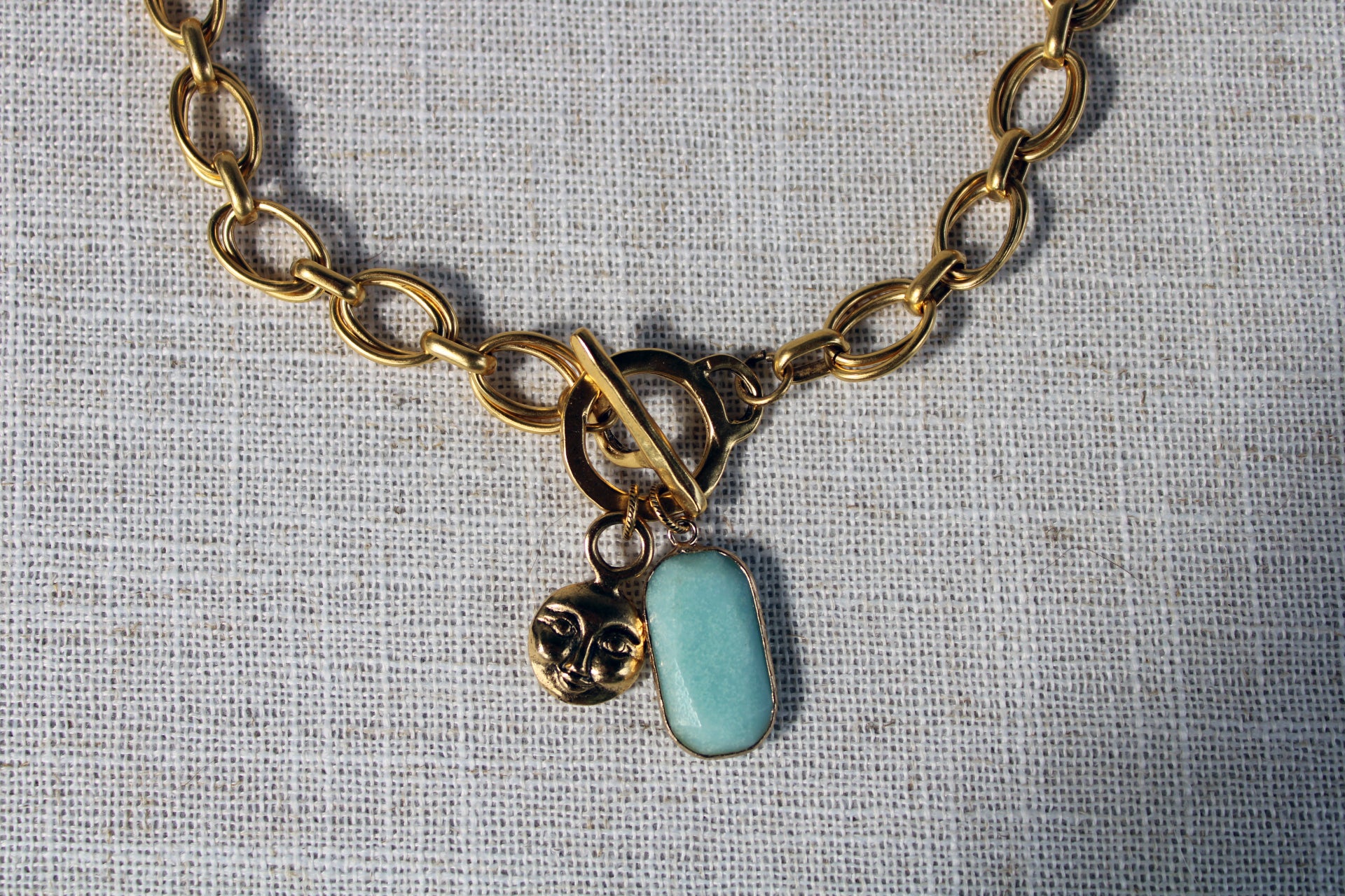 Short chain (16in) one of a kind necklace with natural Amazonite gemstone pendant on a 12k gold plated oval chain. Also features a 12k gold plated moon charm and front toggle closure.