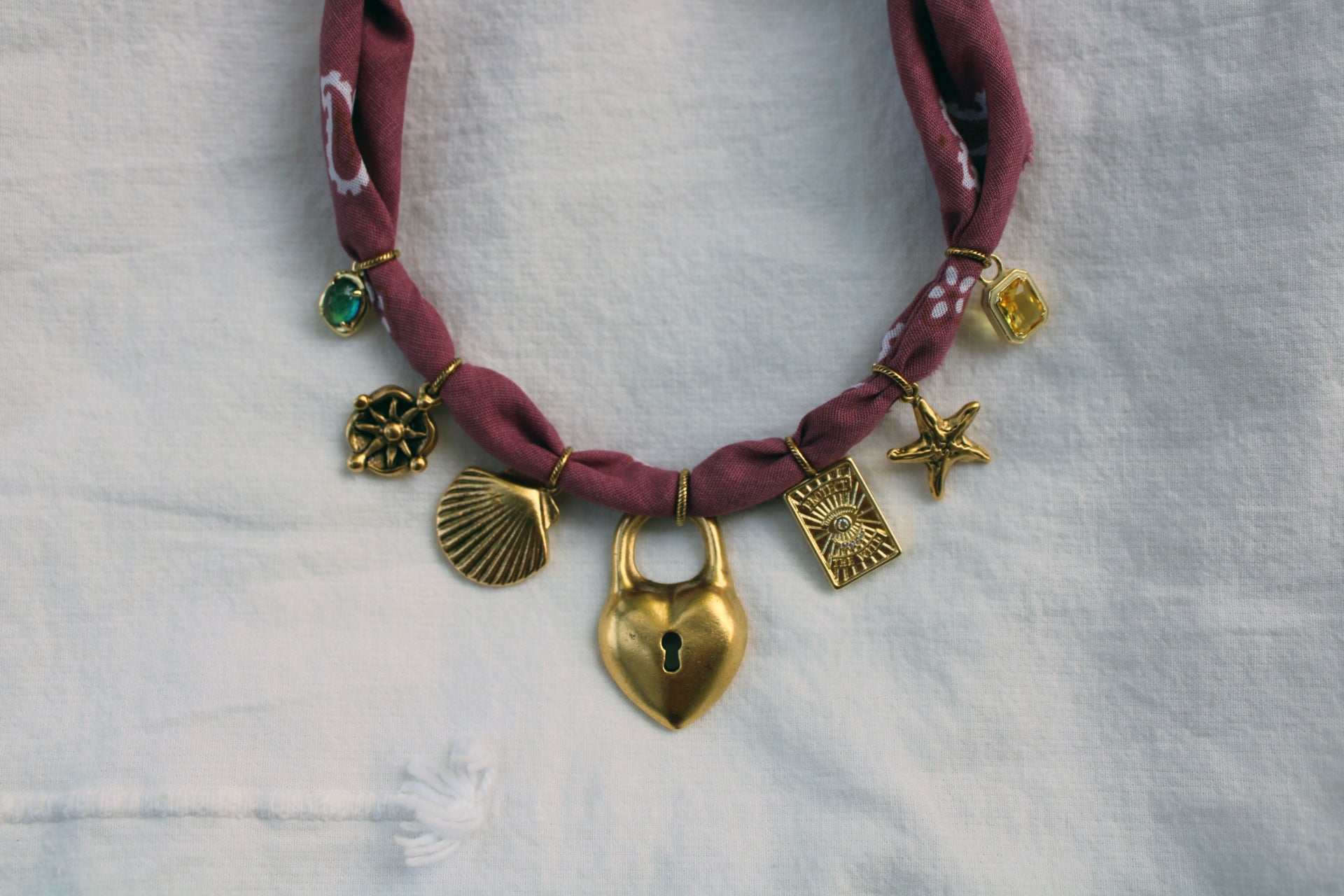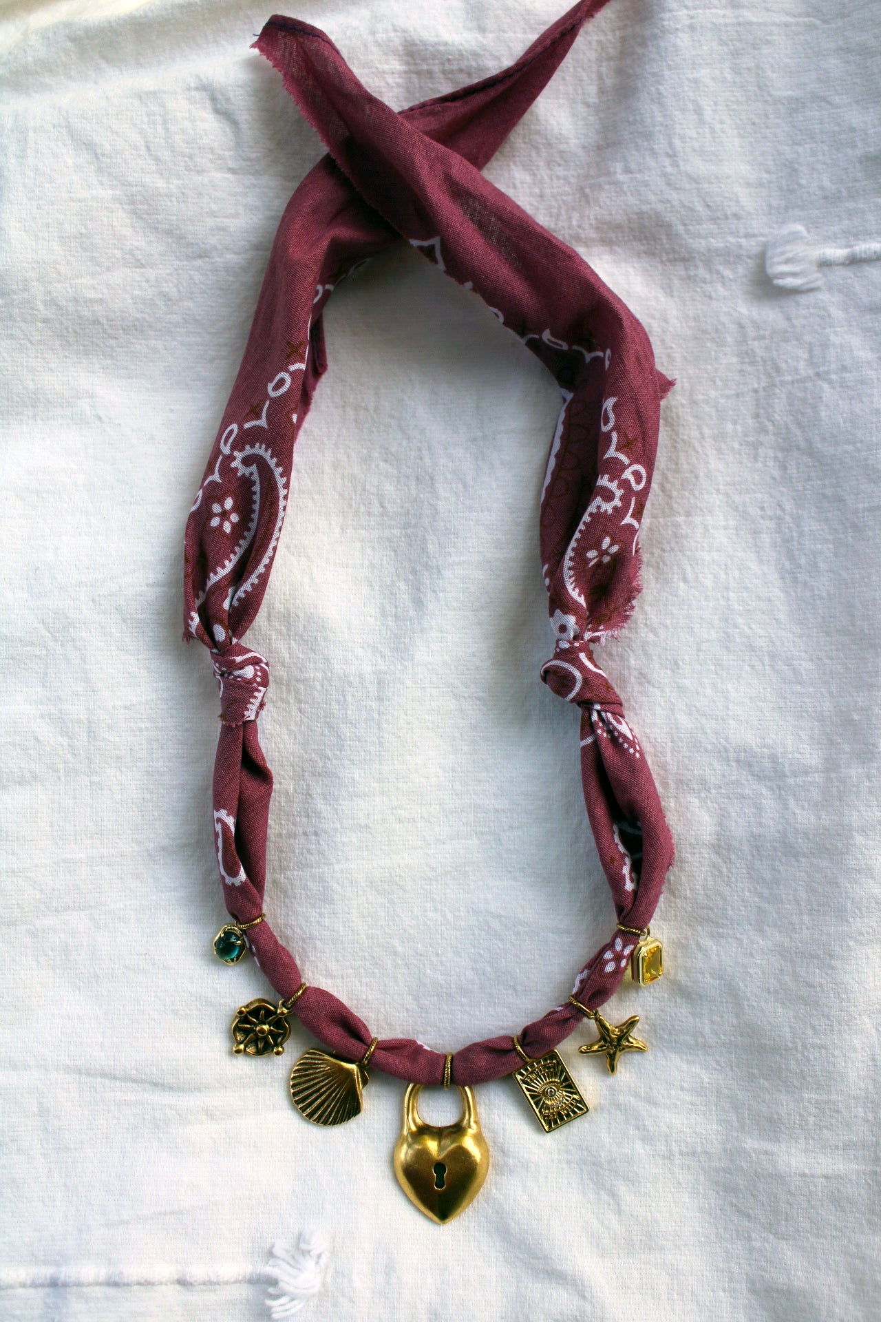 One of a kind handmade necklace with 12k gold plated charms on a hand cut, rosy mauve bandana. Bandana necklaces can be tied to your desired length.