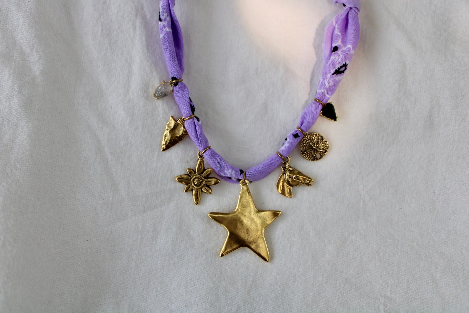 One of a kind handmade necklace with 12k gold plated charms and natural stones on a hand cut, sun bleached lavender bandana. Bandana necklaces can be tied to your desired length.